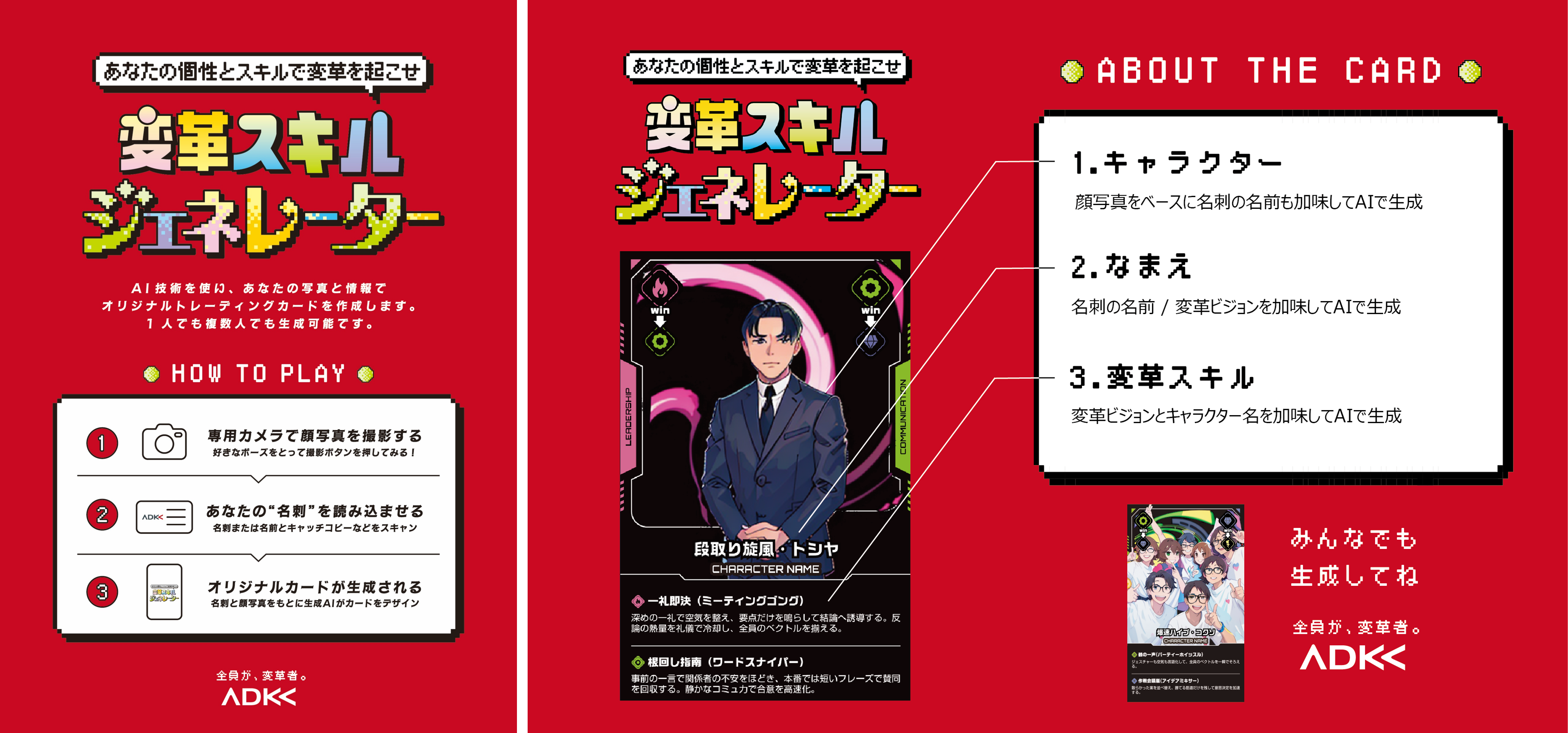 本コンテンツは、ADKグループにおけるAIの自社内活用や、対外的な価値提供などのAI戦略を検討・実行する社内横断組織「AIX委員会」のサポートのもと企画されました。体験型筐体は株式会社ピラミッドフィルムクアドラ(本社:東京都港区、代表取締役:石川 淳)の協力により、「AI転生ビジネスカードバトル!よろしくデスマッチ!(通称:よろデス)」をアップグレードしたもので、企画・グラフィックなどは、AIX委員会やADKグループのクリエイターがデザインしました。