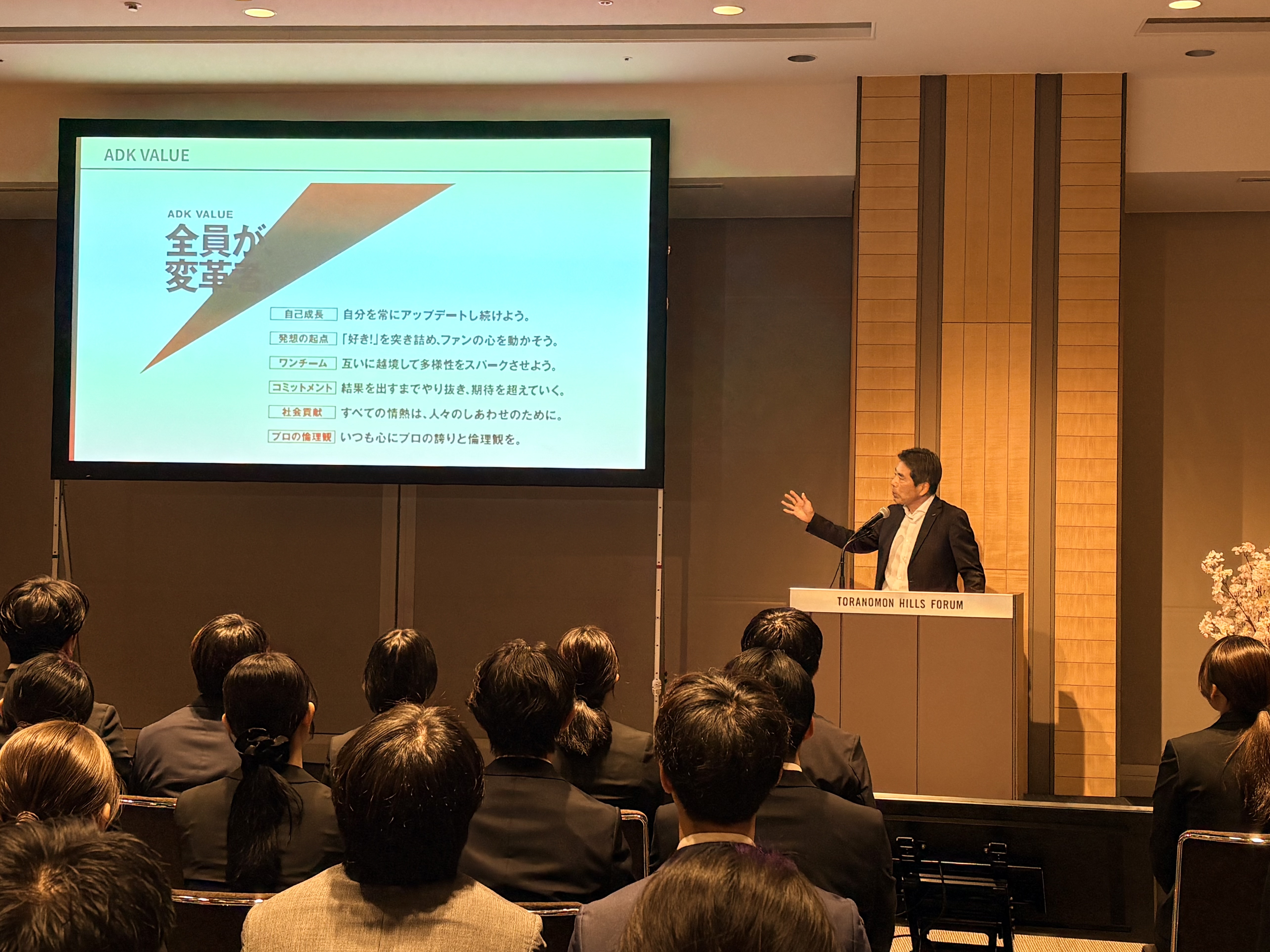 式典では、代表取締役社長 CEOの大山俊哉が登壇。創業70年を迎え、常に変革を続けてきたADKの歩みを振り返りつつ、「AIが答えを出す時代だからこそ、問いを立て、人の心を動かす『意志』が重要になる。常に新しい領域に挑み続けることこそが私たちの存在意義である」と新入社員に向けて祝辞を贈りました。